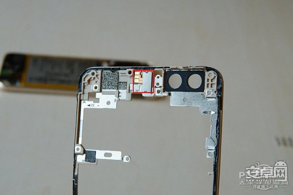 在卸下骨架的螺丝之后,我们发现这玩意也是用粘合剂与金属中框粘合的。当然,这在一定程度上防止了水分从手机侧方渗入。