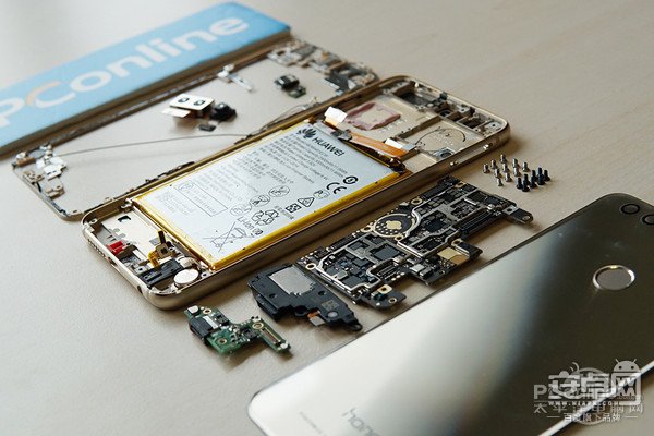 荣耀8机身内部依然采用了经典的三段式设计,上面部分为主板,中间是电池。而下方则是尾插/扬声器部分。